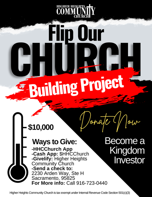 Operation Flip Our Church is a 6-month building campaign that will support the expansion of the Higher Heights Community Church’s ministry. We have occupied our current space for approximately 2 years now, and as we continue to grow, things are sure to change according to the leading of the Holy Spirit and the vision that He gives our Pastor, Pastor Dennis Austin. HHCC will flip the sanctuary so that the front stage area will be on the East wall and the backs of the people will be toward the entry doors. This change will present less distraction to what’s happening in the entryway, and more focus on God and worship. This flip will require the following: