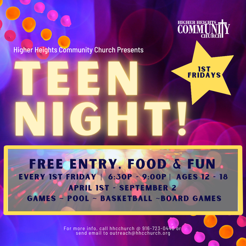 Teen Night is hosted by HHCC every 1st Friday night through the Spring and Summer months. It is designed for teens ages 12 - 18 to come together and enjoy an evening of food, fun, and safety while building new friendships.